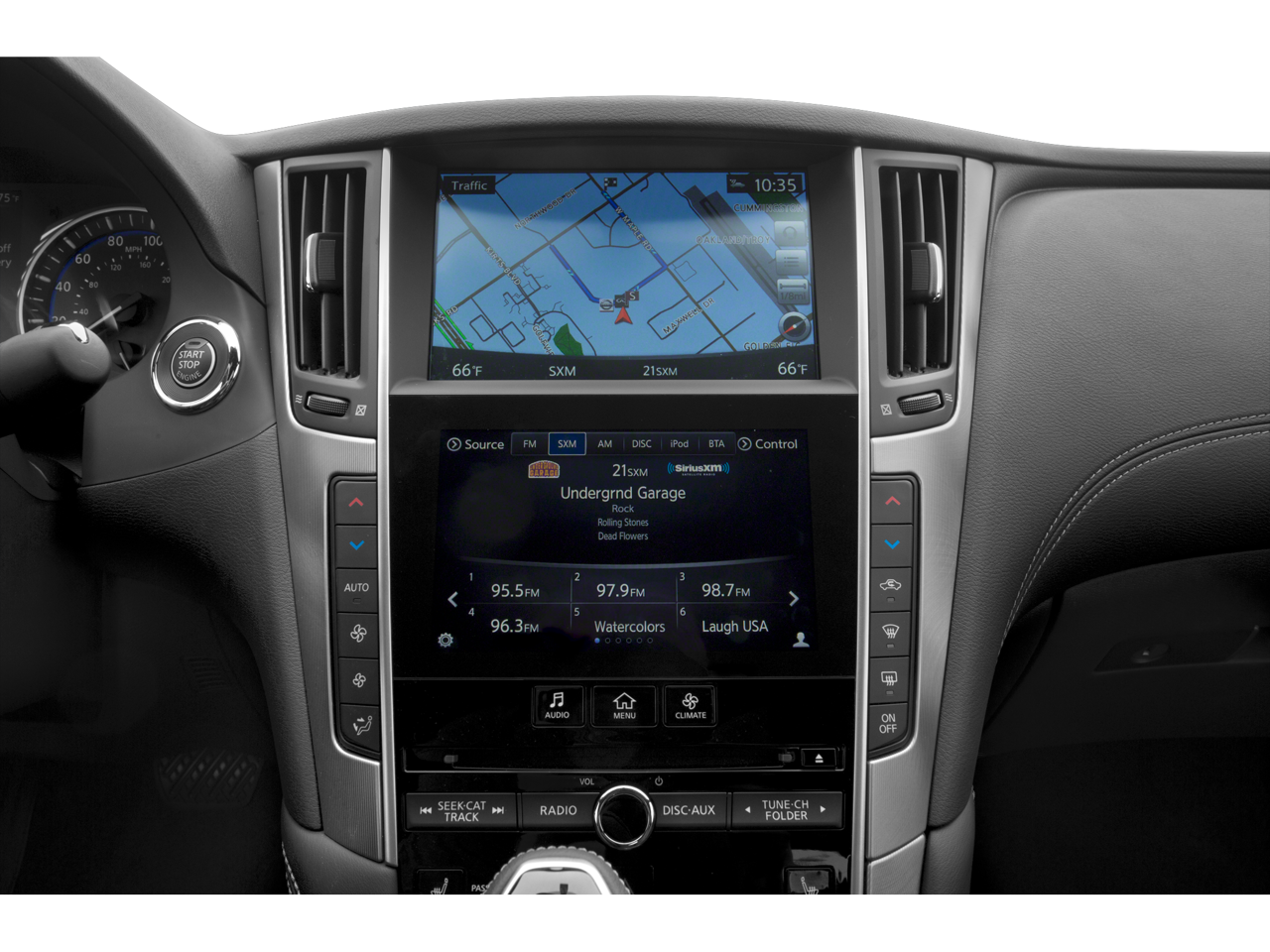 - Radio: AM/FM HD Radio -inc: Bose performance series 13-speaker premium audio system w/genuine metal speaker grilles, CD, MP3 playback, speed-sensitive volume control, Bluetooth® hands-free phone system w/hands-free text messaging assistant plus, 2 USB connection ports for iPod interface, flash drive, and other compatible devices, auxiliary input jacks, SiriusXM satellite radio w/90-day trial subscription, Traffic/Travel Link w/4-year complimentary subscription, Bluetooth® streaming audio, steering wheel-mounted audio controls and INFINITI voice recognition for audio and vehicle information systems